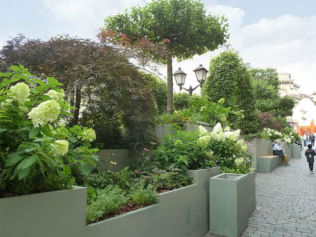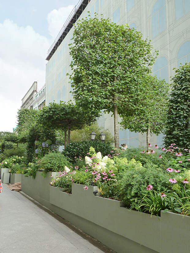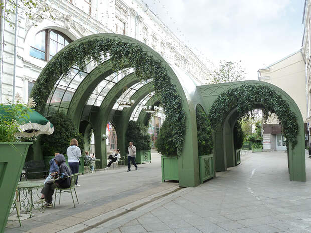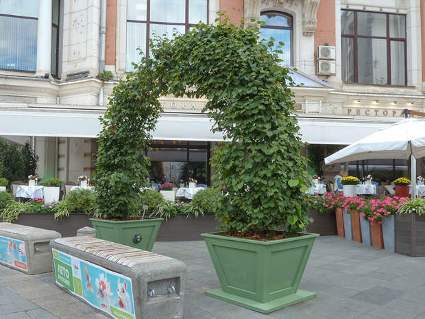 Улица Кузнецкий Мост в начале летнего сезона превратилась в настоящую смотровую площадку ландшафтного искусства. Здесь раскинулся многоуровневый сад, а вокруг высадили липы с фигурной кроной. Эти деревья были под-стрижены в виде шпалер и крыш, благодаря чему появился эффект сказочного городка в зелени. Липа — символ мира и долголетия, а ее нежный аромат наполнял пространство особой атмосферой уюта и спокойствия