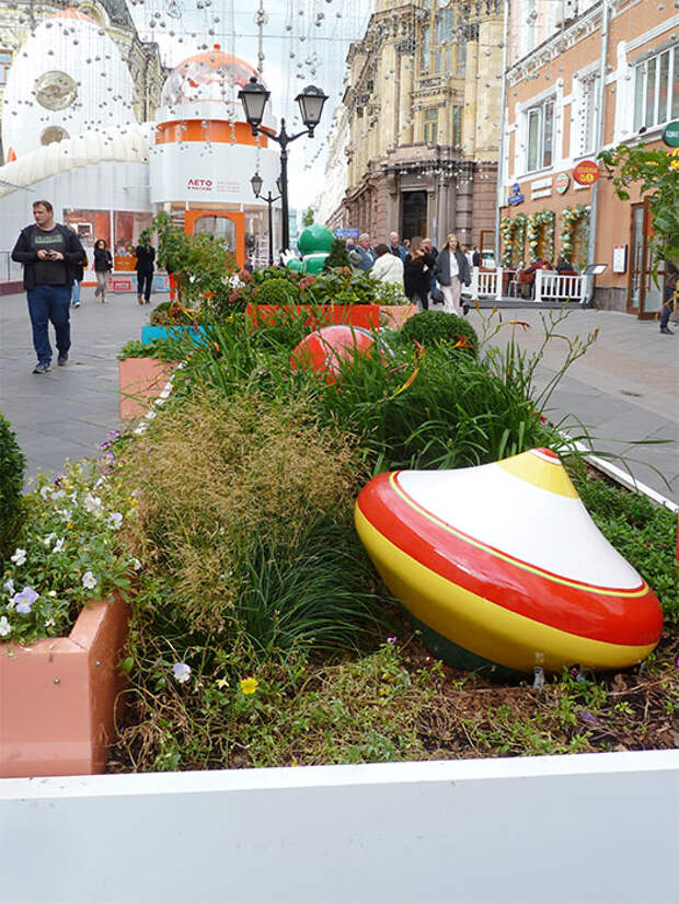 Оформление улицы Рождественка погружало в атмосферу детства, а юным посетителям дарило яркие впечатления и эмоции. Основу оформления составляли композиции с цветами, а о детстве напоминали трогательные символы - гигантские неваляшки, юла, кубики и другие игрушки
