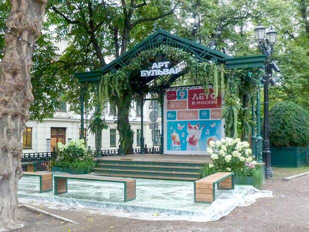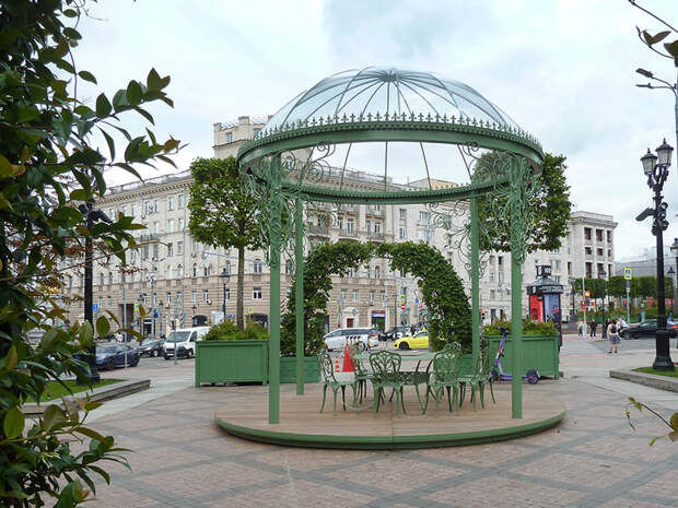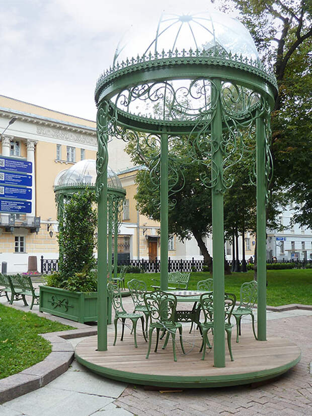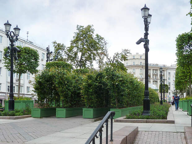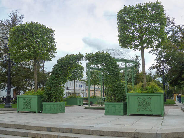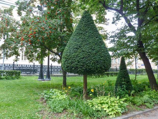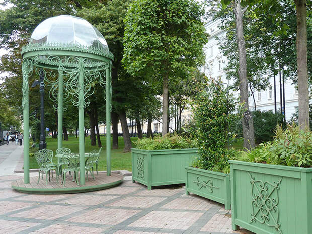 Тем, кто любит изящные линии французских садов, отправлялись на Никитский бульвар гулять среди оттенков зеленого – от темной листвы лип с кубическими кронами до нежной зелени астильбы и хосты и мятных тонов различных трав. Оливковый цвет декоративных элементов дополнял палитру и придавал саду завершенный вид.